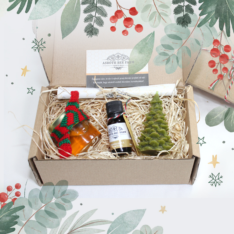 Balenie obsahuje:  50g med s vianočnou dekoráciou, 10 ml propolisová tinktúra, vianočný stromček zelený s borovicovou vôňou a trblietkami.